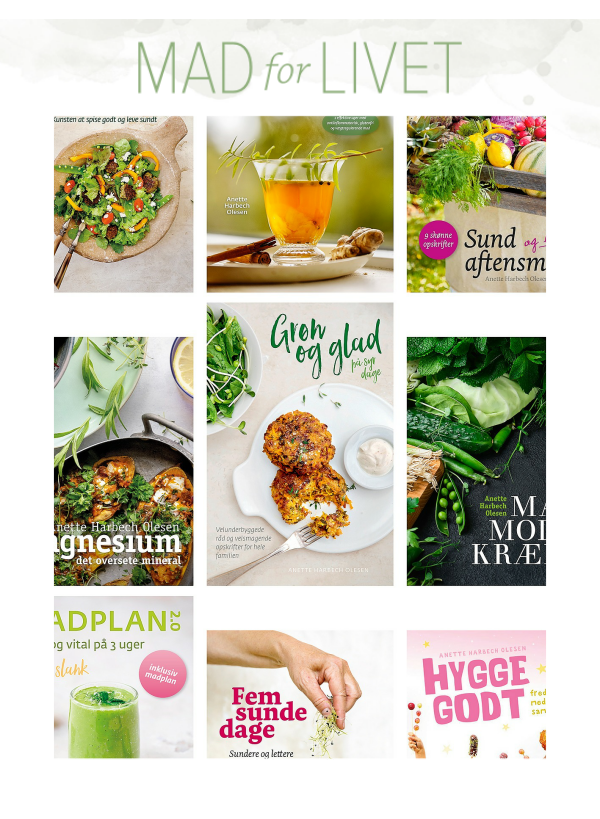 Til alle jer, der er trofaste modtagere og læsere af Madforlivet nyhedsbrev, tilbyder jeg her et udvalg af nogle af mine mest populære e-bøger. Her kan du få ny inspiration til sunde måltider, prøve den antiinflammatoriske madplan, der har vist ganske fantastiske resultater, prøve fem sunde dage, eller lade dig inspirere til at lave en madplan med nye opskrifter med Madplan 2.0. Det gør både livet lettere og sundere, og giver dig ny energi og vitalitet inden sommerferien. Du kan læse mere om magnesium, et mineral, som alt for mange danskere mangler, og finde masser og masser af skønne skønne, inspirerende opskrifter, også på sund fredagsslik i e-bogen Hygge godt.